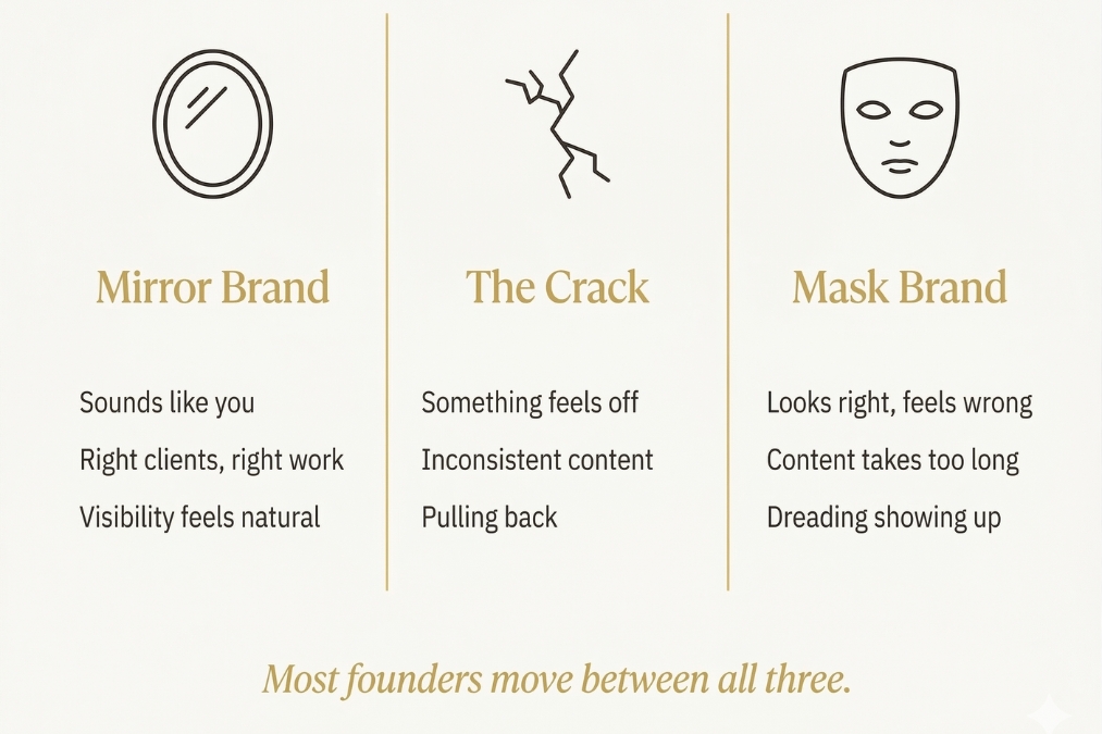 A mask brand is one built to perform a version of the founder that the market seems to want. It often looks polished and credible. But something is off underneath. The content takes too long to write because the founder is translating, not expressing. The clients who come through are almost-right. Showing up consistently feels like maintenance instead of conversation.